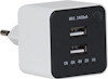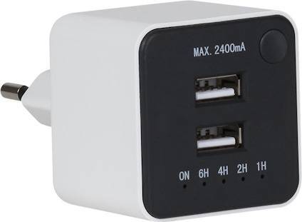 Laddare med 2 st USB-uttag. Inbyggd nedräkningstimer gör att du inte laddar mobilen hela natten. Manuell påslagning. Timern styr frånslagningen per automatik vid valt antal timmar (6, 4, 2 eller 1 timme). Blå lysdioder visar varje nedräkningsperiod. Max 2.4 A när 2 USB-portar används samtidigt.