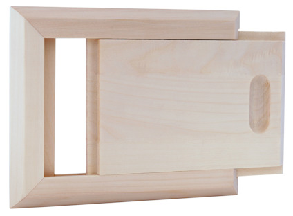 Skjutventil i asp. Ventil för bastuns frånluft. Dold infästning i ventilens ram. Bredd, djup, höjd 215x15x170.