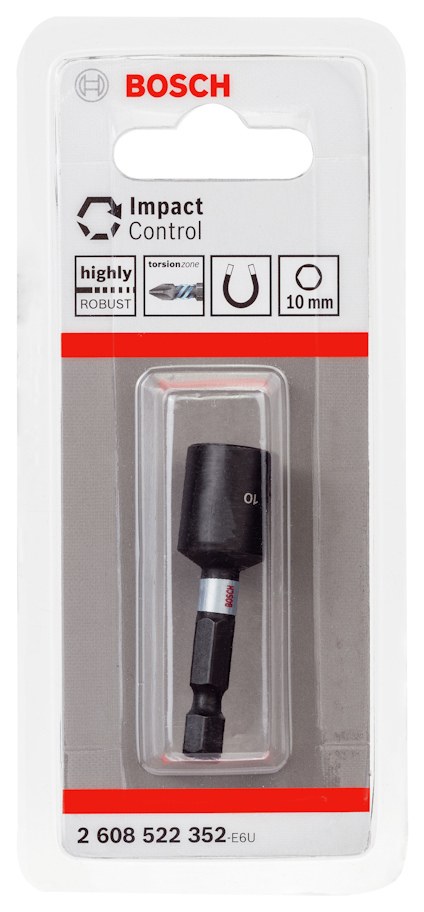 Mycket robust - Impact Control-mutterdragaren är mycket robust och tål även hög effekt från slagskruvdragare. Dess utökade torsionszon gör mutterdragaren extra tålig för långvarigt arbete, medan S2 Modified Steel och optimerad värmebehandling ger extra hållbarhet för utmärkt funktion. Produkten är perfekt för krävande arbeten, t.ex. fabriksinstallationer eller tungt industriellt arbete. Den har ett 1/4-tums utvändigt sexkantsskaft för användning med skruvdragare och speciellt med slagskruvdragare. Mutterdragaren ingår i Bosch Pick and Click-system, som möjliggör enskilt byggbara tillbehörsatser för helt anpassningsbara borrsatser. Klickpassningsfack för enskilt inköpta paket ger en personligt anpassad sats och enkelt utbyte av gamla paket. Sexkantsskaft för maximal kraftöverföring hos standard trebacksborr och sexkantiga skruvdragarchuckar.