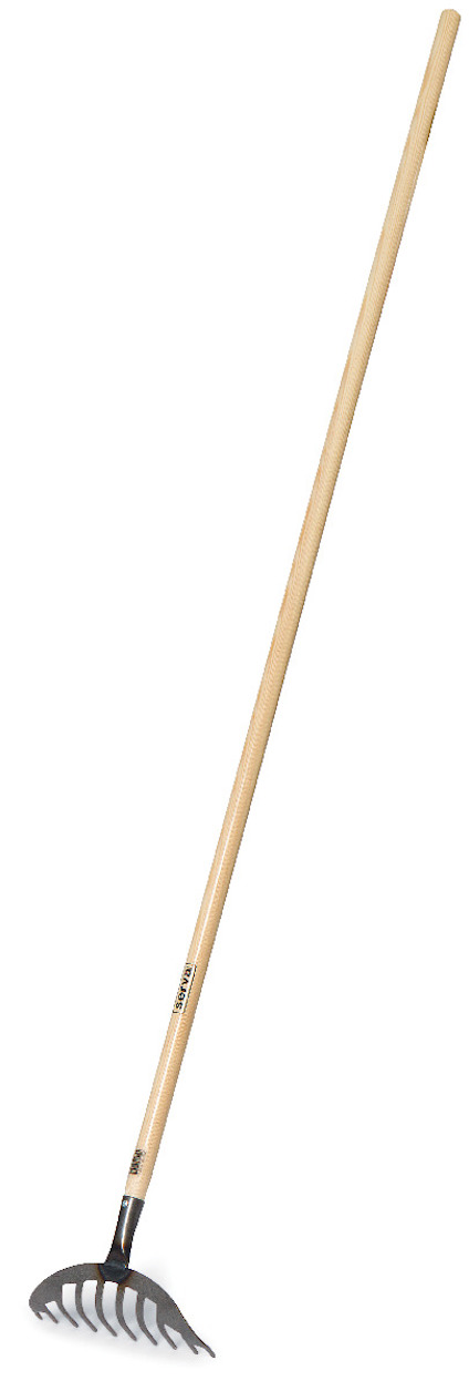 Roskratta Serva. 10 pinnar av helpressat stål. Med "runda skuldror" som inte hänger upp sig bland plantor och buskar. 26 mm lackerat träskaft. Läs mer
