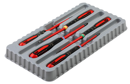 ERGO™ sats med VDE-isolerade smala skruvmejslar med trekomponentshandtag för spår-, Pozidriv- och Torx®-skruv – 5 delar Sats med skruvmejslar med tunn klinga (klinga med mindre diameter), 5 delar, för spår-, Pozidriv- och TORX®-skruv. Innehåller 0,5X3,0, 0,8X4,0, PZ1, PZ2, T10. Skruvmejsel utvecklad enligt den vetenskapliga ERGO™-processen. Svartoxiderad spets för bästa precision och ingen risk för att det bildas flagor. Trekomponentshandtag för maximal komfort, bekvämt grepp i mjukt material med räfflad yta för maximal kraftöverföring. Beständig färgmärkning i handtagets båda ändar för lätt spetsidentifikation. Plan yta för att förhindra att verktyget rullar iväg. Upphängningshål. Isolering av hög kvalitet som är fastgjuten direkt på klingan. För bättre åtkomlighet är klingorna 30% smalare än på en vanlig isolerad skruvmejsel. Testad och godkänd för arbete under spänning upp till 1 000 V. Individuellt kontrollerade och tillverkade i enlighet med IEC 60900, testade i vattenbad med 10 000 V. Levereras i en pappkartong.
