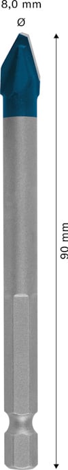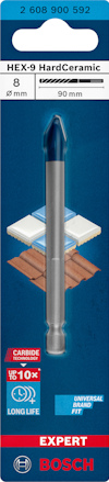 Håller upp till 10 gånger längre än CYL-9 Ceramic kakelborr - Eftersom väggkakel har blivit större och hårdare är det numera väldigt krävande för kakelborret när man borrar i dem. Bosch har därför utvecklat EXPERT HardCeramic borr, som kan torrborra i hårda kakel och klinker och håller mycket längre än våra standardkakelborr. Det här specialiserade, hårda kakelborret använder Bosch Carbide Technology – den hårdaste metall som finns – och kombinerar den med en avancerad mångfacetterad spetsdesign som fördelar belastningen över flera asymmetriska ytor. Den komplexa borrspetsen har konstruerats med hjälp av tillverkningsteknik för finslipning och möjliggör också en exakt startpunkt utan att borret glider eller repar ytan. Bosch EXPERT HEX-9 HardCeramic-borret är konstruerat för borrning i kakel och klinker och kan borra hål i hårda plattor utan smörjmedel eller kylning. Hex shank for strong connection and maximum torque transmission in three-jaw chucks and ¼" internal hex tool holders.