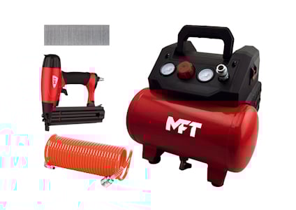 Praktiskt set i fyra delar som består av MFT 106/OF Oljefri kompressor, MFT F50D minidyckertverktyg, 5 m lång PU spiralslang och 2 500 st 40 mm minidyckert. Kompressorn har en motoreffekt på 1,2 Hk (880W) med max lufttryck på 8 bar. Tankvolymen är 6 liter. Minidyckertverktyget är avsedd för bruk med minidyckertspik (1,2 mm) 15-50 mm. Levereras i en solid förpackning.