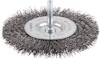 Stålborste, vågformad tråd, 100 × 0,3 mm, stål Fin finish på stål - Stålborsten ger en fin ytfinish. Den har vågformad tråd för lätt till medeltung rengöring på små ytor och är idealisk för att avlägsna anlöpningsfärg på svetsfogar. Stålborsten passar för rengöring av mindre stålytor, kanter och spår med hög rotationsfrekvens. Den är också lämplig för rostborttagning, ruggning, mattslipning och färgborttagning. Den kan användas med borrar med 6 mm skaft. Borsttrådarna finns i olika tjocklek beroende på hur mycket som ska slipas. Tjockare trådar är aggressivare och ger grövre ytfinish medan tunnare trådar ger finare och jämnare ytresultat. Cylindriskt skaft som passar till trebackschuck.