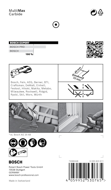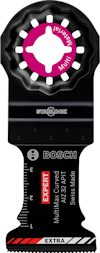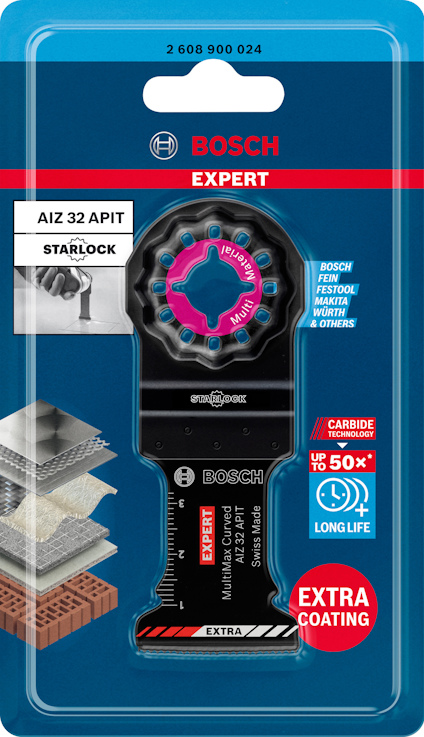 Håller upp till 50 gånger längre än Bosch AIZ 20 AB-blad - Oavsett om du arbetar med fastigheter eller fordon kan ett multiverktygsblad som skär effektivt i alla material underlätta arbetsdagen en hel del. Genom att integrera alla Boschs mest avancerade tillverkningstekniker ger EXPERT MultiMax oöverträffad mångsidighet till ditt multiverktyg. Det här förstklassiga multiverktygsbladet rymmer det allra senaste inom Bosch Carbide Technology: Remsan med ultrahårda tänder är baserad på Boschs unika Curved-Tec-design, så detta är det första bladet som hanterar instickssågning i metallplåt utan skrammel. Dessutom har det senaste nytillskottet i EXPERT MultiMax-familjen extra beläggning på hårdmetalltänderna för ännu längre livslängd. Bosch Curved-Tec-blad blev en självklar favorit tack vare deras förmåga att noggrant angripa material och skapa svåra snitt med hög standard. Med Bosch EXPERT MultiMax Blade för multiverktyg kan du använda instickssågning i de mest krävande material, exempelvis metallplåt, kolfiber och rött tegel. Starlock-fäste för optimal kraftöverföring och smidiga bladbyten på tre sekunder.