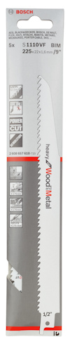 Snabb sågning vid rivning - S 1110 VF Heavy for Wood and Metal tigersågblad sågar snabbt i trä och metall. Bladet har en bred, avsmalnade kropp (22 mm) och extratjockt material (1,6 mm) som ger den optimala stabilitet som är nödvändig vid rivningsarbeten. Det sågar kontrollerat och rakt utan risk för böjning. Dess Vario-tandutformning och stora spånrum transporterar effektivt bort material och snabbar upp arbetet. Bladets fullt härdade tandrad av HSS (snabbstål) är hopfogad med bladet av högelastiskt HCS (stål med hög kolhalt) till en bimetall, som gör bladet perfekt för att såga i medelhållfast stål inkapslat i trä. Bladet har en standardlängd på 225 mm för en skärförmåga upp till 175 mm. För användning med tigersågar med ett universalskaftsystem på 1/2 tum. Passar alla tigersågar med S-skaft.