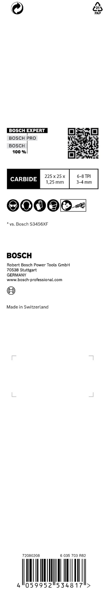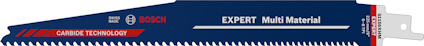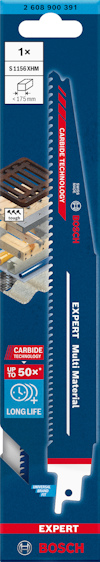 Håller upp till 50 gånger längre än S3456XF-blad från Bosch i tuffa material - Många blad som marknadsförs med frasen ”för multimaterial” fungerar utmärkt till trä och mjuk metall, men klarar inte av att såga i hårdare material som skruvar eller metallbeslag. EXPERT ‘Multi Material’ har inga sådana problem: Hårdmetalltänderna kan såga de hårdaste stålkvaliteterna – om och om igen. En fungerande lösning på problemet med blad som helt enkelt inte håller på den moderna arbetsplatsen – Bosch EXPERT 'Multi Material' tigersågblad är en tillförlitlig partner som skär mer än bara metall och trä. Plast, kompositmaterial och förfabricerade element som används på byggarbetsplatser kapas på ett tillförlitligt sätt tack vare Bosch Carbide Technology. Den moderna tanddelningen är utformad för att skära i både tunna och tjocka material. Eftersom Bosch EXPERT 'Multi Material' tigersågblad håller så mycket längre och fungerar på alla material är det otroligt användbart för hantverkare, som höjer produktiviteten och minskar kostnaden för blad. Passar alla tigersågar med S-skaft.