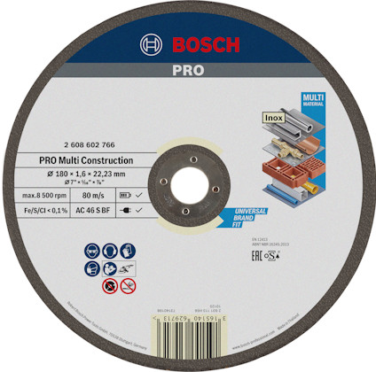 Multi Construction Rapido kapskiva möjliggör kraftfull och snabb kapning av olika material. Dess speciella slipblandning möjliggör arbete i olika material. Dessutom möjliggör den tunna skivan enkel och snabb kapning med liten ansträngning, mindre buller och minimal dammbildning. Använd den här skivan för kapning av metall, rostfritt stål, järnfria metaller, sten, marmor och plast. Bosch kapskivor uppfyller de högsta säkerhetskraven, till exempel EN 12413, FEPA och oSa. Den är kompatibel med vinkelslipar.