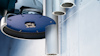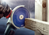 • Vinkelslip med blått skivblad kapar ett svart rör mot en bakgrund av röda tegelstenar.