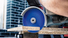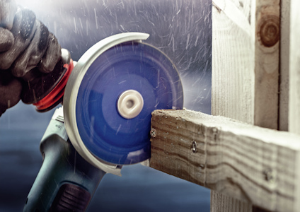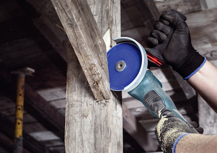 • Person som använder en blå vinkelslip för att skära i en vit vägg. Svarta handskar och kort ärm syns.