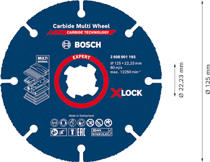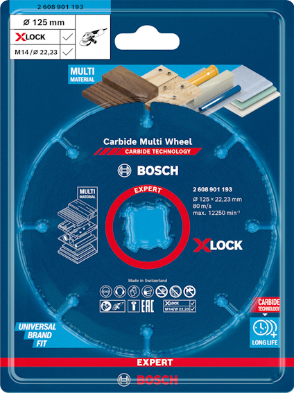 EXPERT Carbide Multi Wheel X-LOCK kapskiva 125 mm, 22,23 mm Carbide Technology för lång livslängd när du kapar Multi Material - Yrkeshantverkare värdesätter vinkelslipars förmåga att såga i svårarbetade material som betong, sten och metall. Med EXPERT Carbide Multi Wheel kan det här fantastiska verktyget bli ännu mer mångsidigt och effektivt skära alla typer av mjukare material som trä, plast och moderna kompositmaterial. I EXPERT Carbide Multi Wheel används vassa hårdmetallkorn längs kanten för att skära extremt effektivt i flera material. Kornen fästs i en stålkropp med laserteknik för extra stark bindning, vilket ger en säker och tillförlitlig kapskiva som bibehåller konstant hastighet och djup under lång livslängd. Med EXPERT Carbide Multi Wheel blir din vinkelslip ännu mer mångsidig. För många hantverkare kan det här vara det enda elverktyg de behöver. Klicka den på plats med X-LOCK – marknadens snabbaste system för byte av tillbehör. Passar även till vinkelslipar med mutter och gänga.
