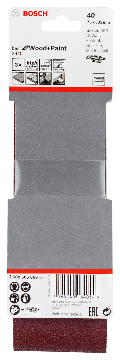 Utmärkt avverkningshastighet - X440 Best for Wood and Paint avlägsnar material i en utmärkt borttagningsgrad vid slipning av gammal färg, fernissa eller träytor. De hårda, halvspröda slipkorn av aluminiumoxid möjliggör slipning av hög kvalitet. Dessutom är stödmaterialet tillverkat av robust x-tyg med en bandfog av hög kvalitet för slitstyrka vid omfattande arbete. Dessutom har slipmaterialet en elektrostatisk öppen beläggningsyta som ger konsekvent borttagning av damm för kontinuerlig slipning. Den här produkten är avsedd för slipning av träytor och belagda ytor och lämpar sig för utjämning av kanter. Den är också optimal för nedslipning av falsar och kanter. X440 Best for Wood and Paint slipband är kompatibelt med bandslipar. Slipkornen hålls fast med en bindning med syntetiskt harts för slitstyrka vid tunga tillämpningar.