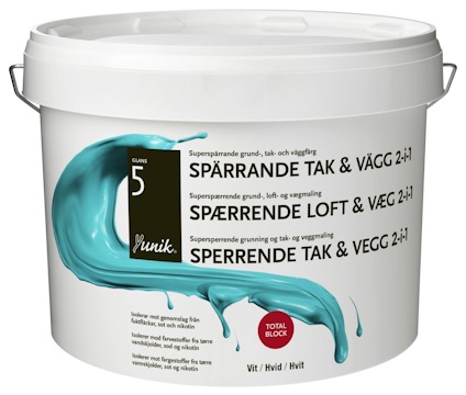 Vattenburen spärrande grundfärg till tak och vägg som ger en helmatt, robust och tvättbar yta. Yunik Spärrgrund tak och vägg är en vattenburen spärrande grundfärg till tak och vägg som kan användas både som grund- och täckfärg. Ger en halvmatt, robust och tvättbar yta. Spärrar mot genomslag från fläckar av t.ex. fuktskada, nikotin och tusch. Används inomhus på väggar och tak av gips, betong, puts m.m., samt tidigare målade ytor.