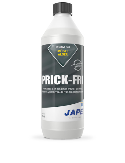 Effektivt mot ytlig påväxt av mögel och alger. För målade, lackade, oljade och obehandlade träytor utomhus t.ex. fasader, underslag, takutsprång, vindskivor, staket, dörrar, portar, fönster, trädgårdsmöbler och trallgolv. Prick-Fri kan användas på alla färgtyper. Påverkar inga byggnadsmaterial negativt. Etsar ej mineraliska material. Vid tveksamhet var möglet växer bör analys av färg och underliggande trä utföras. Med provsvaret bifogas en objektsanpassad arbetsbeskrivning. Om det växer i ett underliggande färgskikt eller om möglet sitter i träet innanför färgskiktet, hjälper inte en behandling med Prick-Fri. Annan åtgärd är då nödvändig, t.ex. borttagning av färg, behandling mot påväxt och ommålning. Provbit med beskrivning av den angripna ytan skickas till Jape Produkter AB för analys.