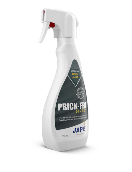 Effektivt mot ytlig påväxt av mögel och alger. För målade, lackade, oljade och obehandlade träytor utomhus t.ex. fasader, underslag, takutsprång, vindskivor, staket, dörrar, portar, fönster, trädgårdsmöbler och trallgolv. Prick-Fri kan användas på alla färgtyper. Påverkar inga byggnadsmaterial negativt. Etsar ej mineraliska material. Vid tveksamhet var möglet växer bör analys av färg och underliggande trä utföras. Med provsvaret bifogas en objektsanpassad arbetsbeskrivning. Om det växer i ett underliggande färgskikt eller om möglet sitter i träet innanför färgskiktet, hjälper inte en behandling med Prick-Fri. Annan åtgärd är då nödvändig, t.ex. borttagning av färg, behandling mot påväxt och ommålning. Provbit med beskrivning av den angripna ytan skickas till Jape Produkter AB för analys.